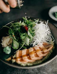 Teriyaki Salmon Bowl 18£Jasmine rice, pickled cucumber, edamame, sesame finish.